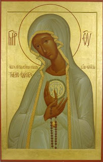 Речь идёт о большой иконе, достойной стать главной алтарной иконой в церкви, ибо Богоматерь, представленная здесь лишь по пояс, напоминает обычные православные иконы, широко почитаемые в России, например, икону Владимирской или Казанской Божьей Матери. Вместе с тем, основной характерной чертой иконы является то, что она полна света. А ведь именно Фатимская Дева была полна света, – того света, который, как говорил пастушок Франциск, «есть Бог». Благодатная – значит наполненная Господом, и в Фатиме она полна света: «Жена, Облечённая в Солнце». Это вплотную приближает Фатиму к богословию иконы. Есть мнение, что первой иконой любого иконописца должна быть икона Преображения Господня – для понимания того, что икона должна приближать мир божественный к миру человеческому, свет Божий к земле, сияние Божие к белой одежде преображённого прославленного Христа. То же самое касается Фатимской Девы.